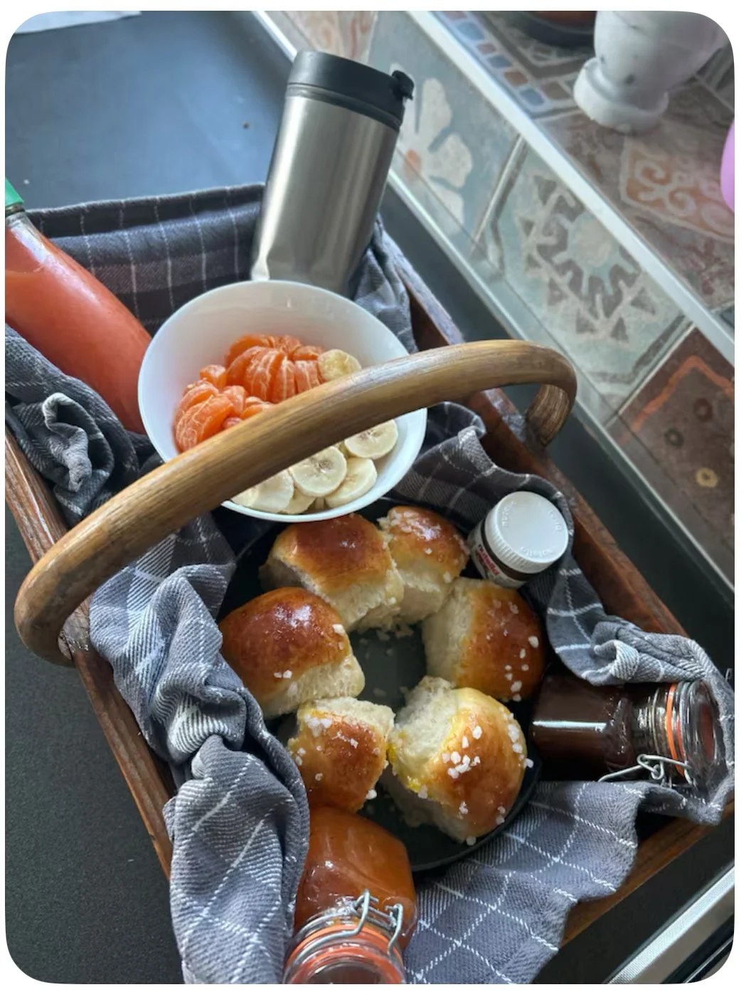 Un réveil tout en douceur : pancakes, gaufres, brioches au choix, fruits de saison et confitures maison ou locales, jus de fruits et boisson chaude au choix.